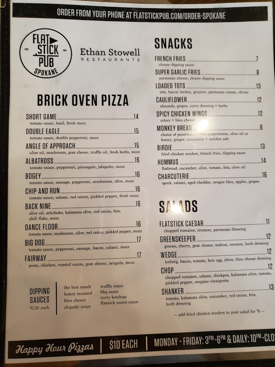 Welcome to Flatstick Pub, a vibrant eatery located in the heart of Spokane, WA. This lively establishment combines delicious pub food with a fun-filled atmosphere, making it a favorite among locals and visitors alike. The menu offers an array of options, including a refreshing House Salad and crispy, satisfying Wings with various sauces, perfect for sharing. If you’re in the mood for something hearty, don’t miss the Birdie, featuring beer-battered chicken tenders served with fries, striking a balance between flavor and comfort.